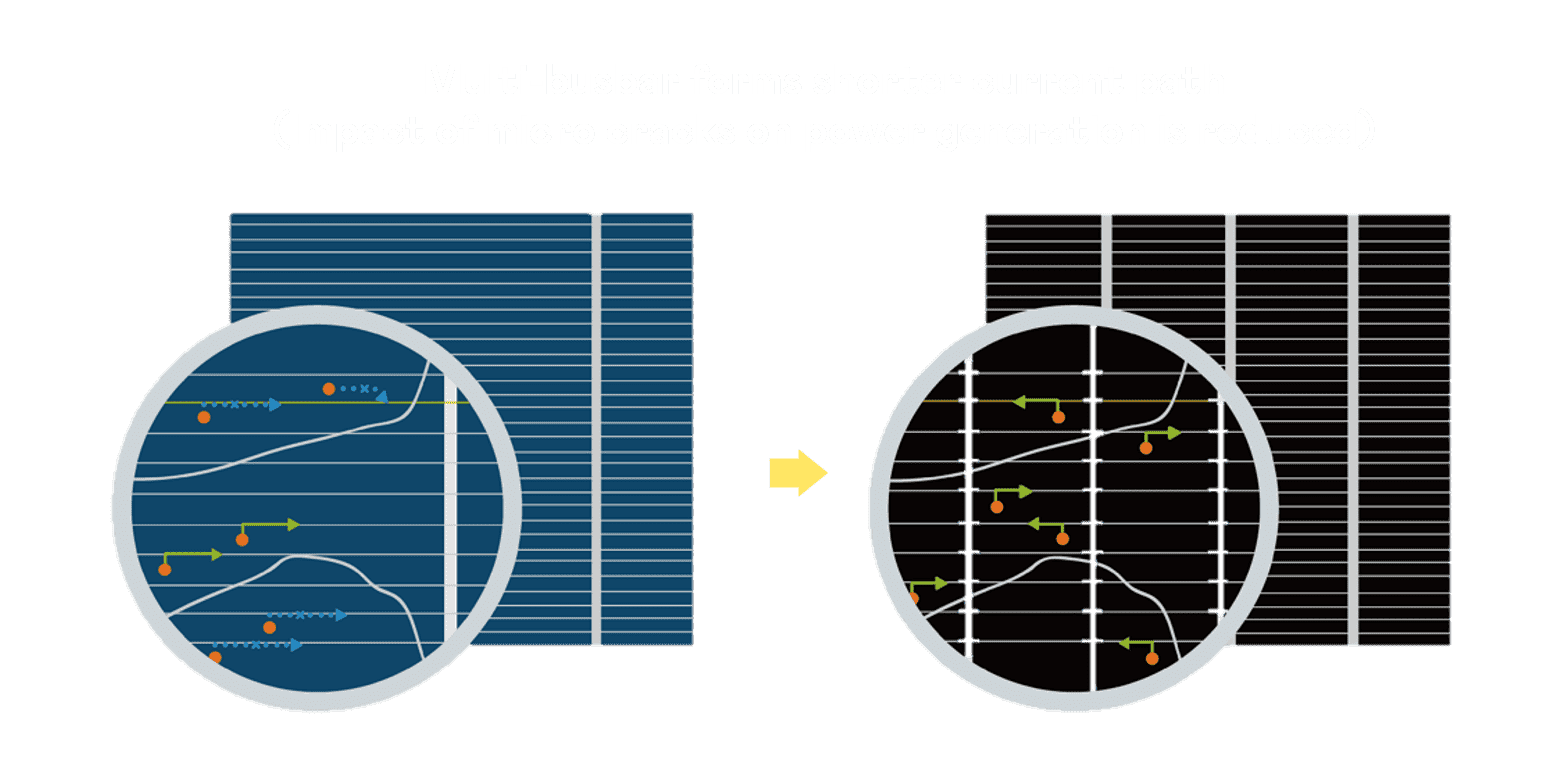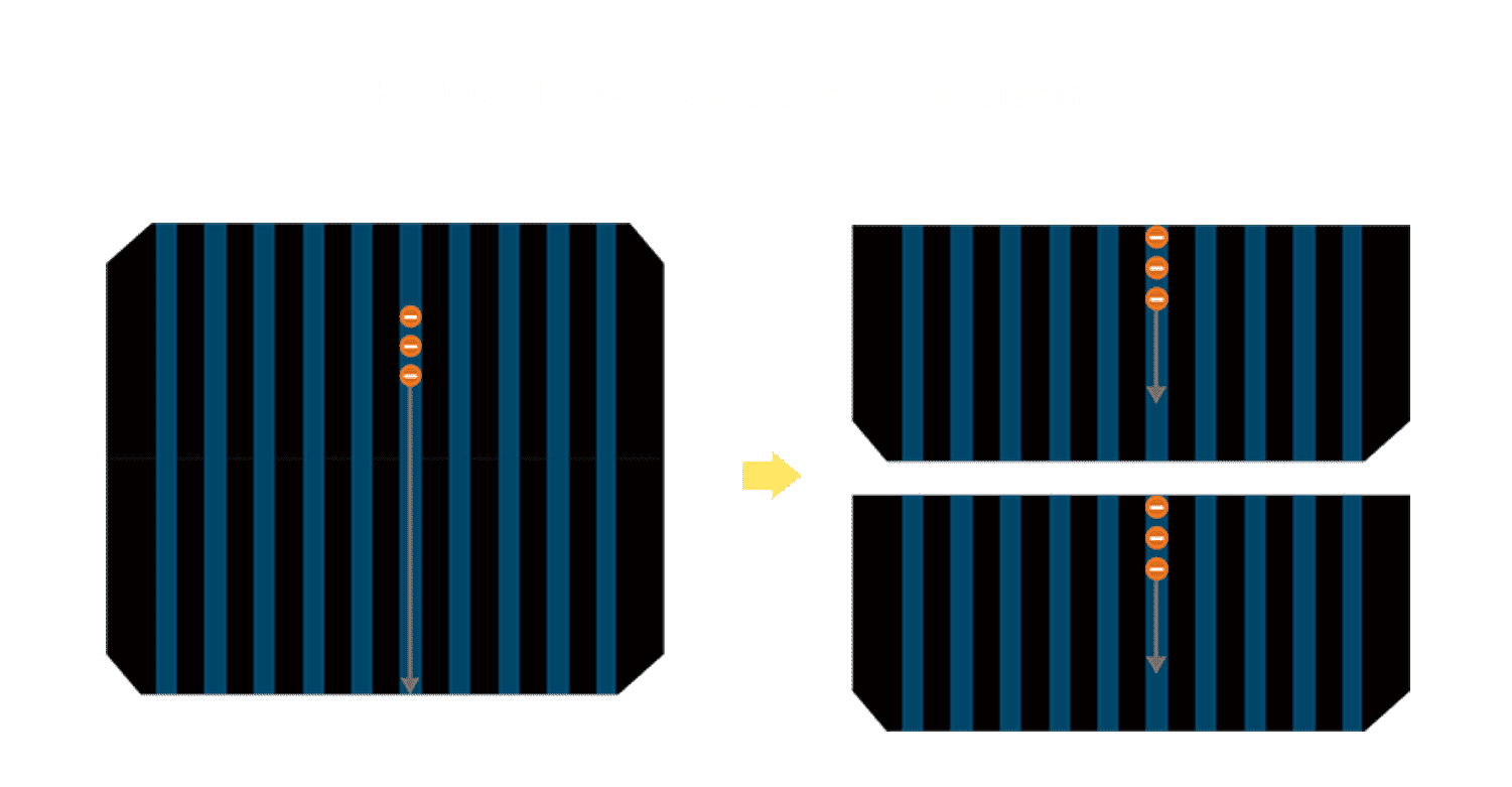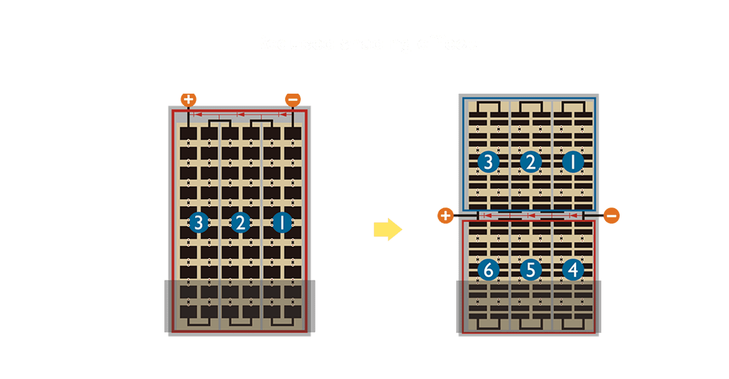 - 结合半切电池,,,,降低遮阴影响、、、、提升模组抗隐裂能力、、、并减少电阻损耗,,进一步提升模组发电效能。。