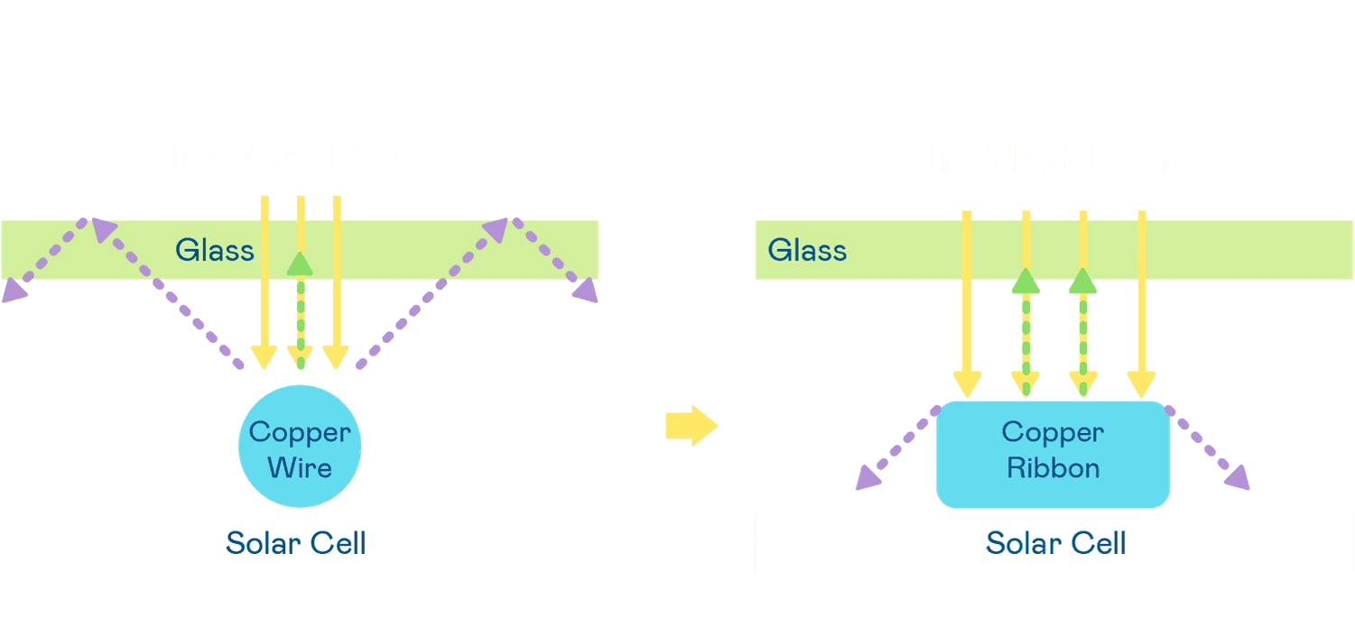 - 电池使用多条铜导线 (Copper wire) 于电池片上形成较短的电流路径,,,提高电流收集效率,,,,采用圆形设计的铜导线较传统扁平式的铜焊带 (Ribbon),,,,可增加入射至电池的光线量。。